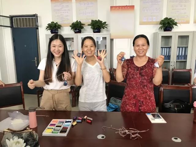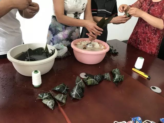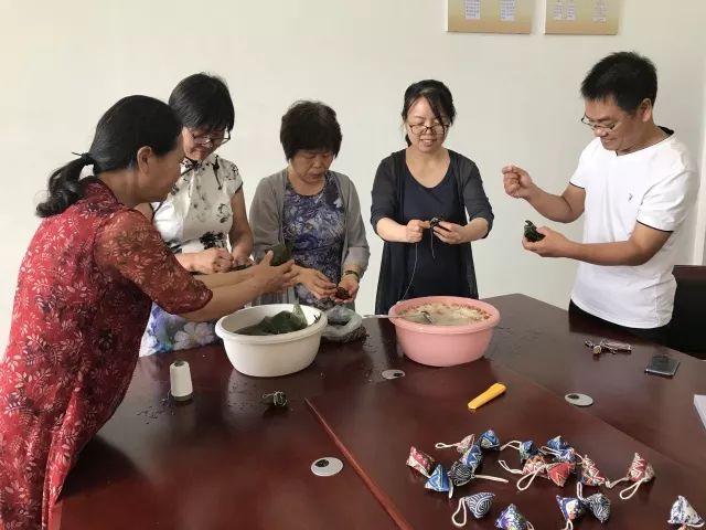 诵读结束后,老师们兴致盎然的参与到传统民俗文化体验活动中去,一起用准备好的粽叶、糯米、红枣、花生等食材包起了粽子,并制作了香包、五彩线等端午节民俗小饰品。大家互相学习,传授技巧,展示劳动成果,在欢声笑语中感受端午佳节的风俗文化。
