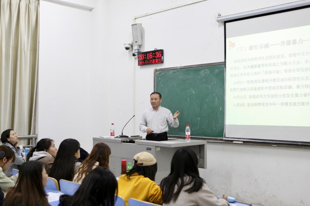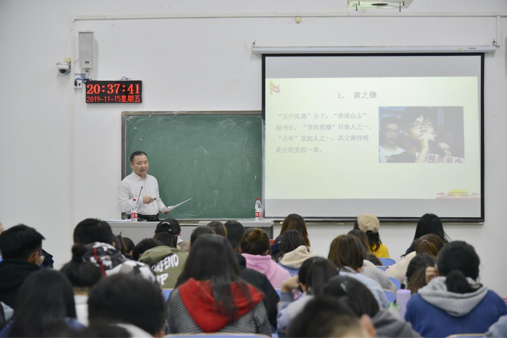 课堂上,田建伟教授首先提出问题:同学们对于香港修例风波是否关注?通过现场调查的方式引入主题。接着,田建伟教授将香港修例风波的演变过程按照时间线展开讲解,帮助同学们全面了解香港修例风波的发展全过程,并从外部因素和内部原因两个方面深入分析了香港风波产生的原因。他向同学们深入阐述了中央对这个问题的基本立场与态度:中央政府将坚定不移贯彻“一国两制”和香港基本法,坚决反对任何境外势力干涉中国内政。