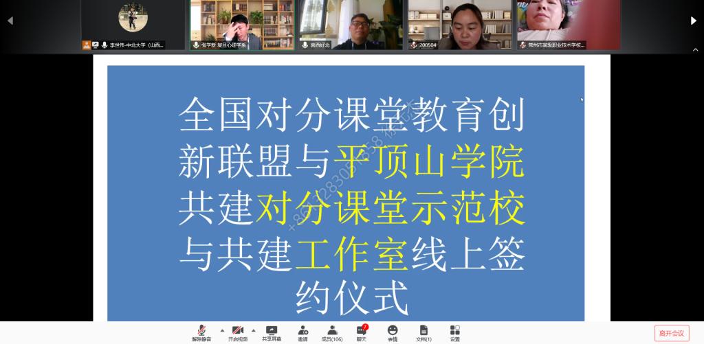 5月4日,谈球吧体育与全国对分课堂教育创新联盟共建对分课堂示范校、思想政治理论课对分课堂工作室、医学对分课堂工作室线上揭牌及签约仪式举行。全国对分课堂教育创新联盟授权代表人、“对分课堂”教学法创始人、复旦大学博士生导师张学新教授,来自全国部分相关高校的专家学者,公司教务处、对分课堂工作室相关负责人共同参加了活动。