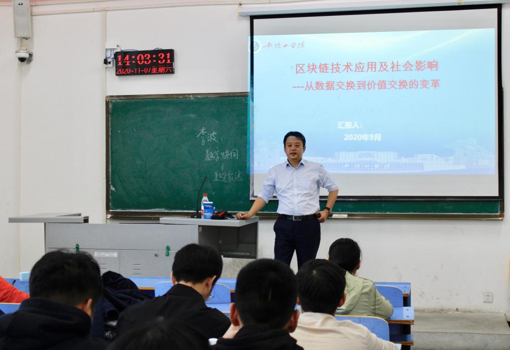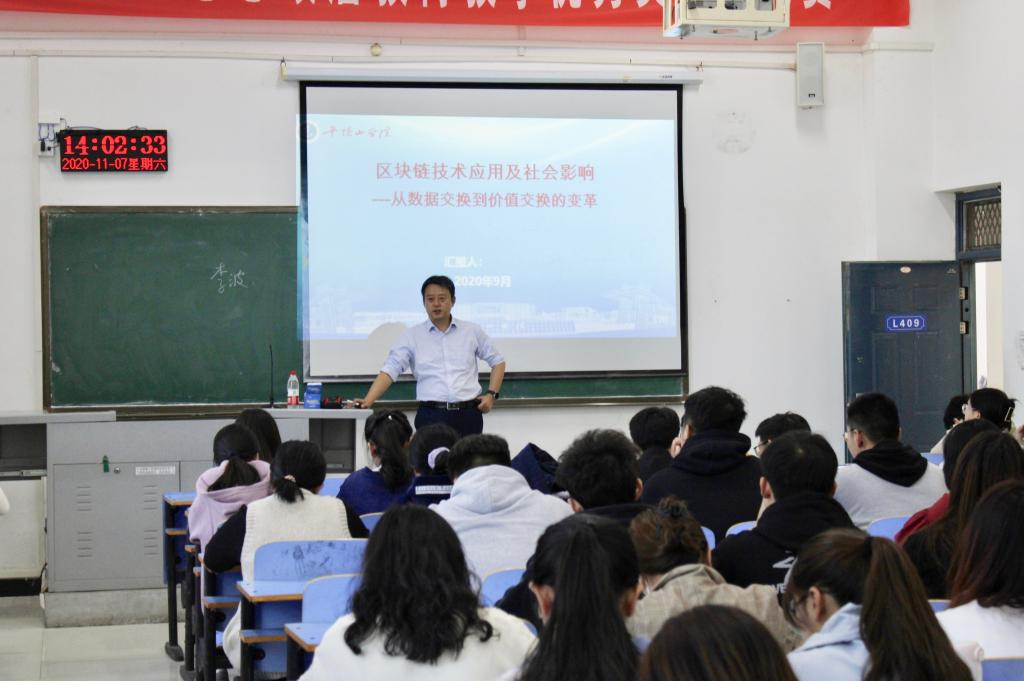 11月7日下午两点,“追梦•领航”思政课在图书馆409教室准时开讲。副董事长李波教授以《区块链技术应用及社会影响》为题,从“数据交换到价值交换的变革”“区块链的前世今生”“区块链应用及其影响”三个方面为同学们展开讲述。