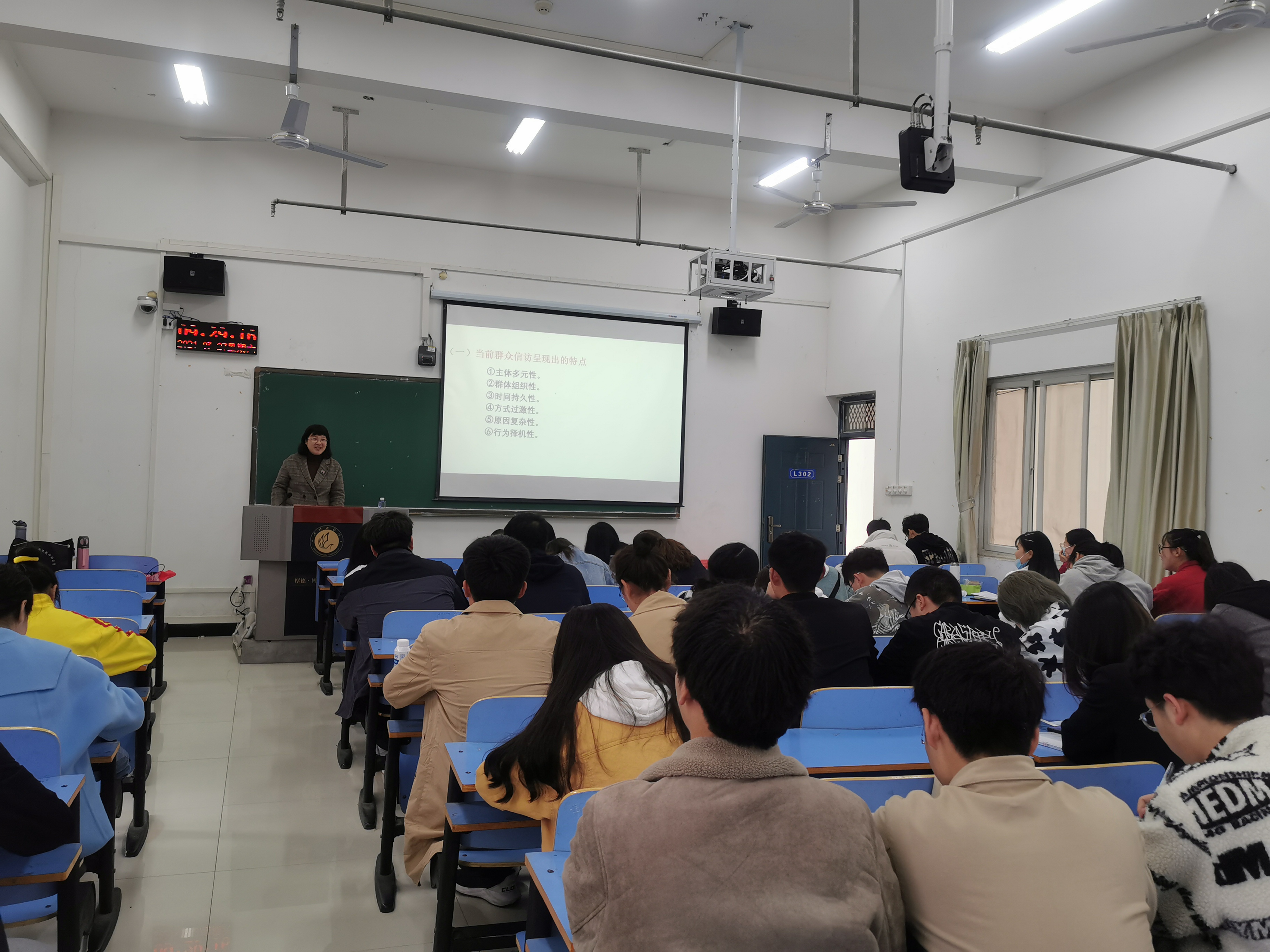 高老师结合自己的本职工作和丰富经验,紧紧围绕信访工作这个主题,从“信访概述”、“党的十八大以来信访工作的变化”、“当前信访工作的特点趋势及主要任务”等方面进行讲述,让同学们对信访工作有了基本的认识和了解。高老师说,信访工作是社会治理的重要组成部分,做好信访工作是党的群众路线宗旨决定的,是国家发展稳定的需要,是人民群众的迫切需求。当前信访工作的主要任务是要深入学习贯彻习近平总书记关于加强和改进人民信访工作思想,做好信访工作服务大局和中心工作,坚持发展新时代“枫桥经验”,持续化解攻坚信访突出问题,着力推进信访法治化建设,严格落实信访工作责任制,加强信访干部队伍建设。与此同时,高老师结合信访工作中遇到的各种矛盾和问题,告诉同学们,每一种制度都是有不完善到逐步完善的过程,在此期间,既要敢于正视问题,也要具体情况具体分析,学会用不同的方式调节,化解问题,促进社会的和谐发展。
